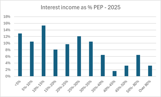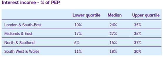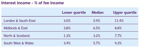If we consider the distribution of data for interest income as a percentage of law firm profits, we can see that for 50% of firms interest income represented between 9% and 35% of their profits and for most firms it represents at least 20% of their profits.